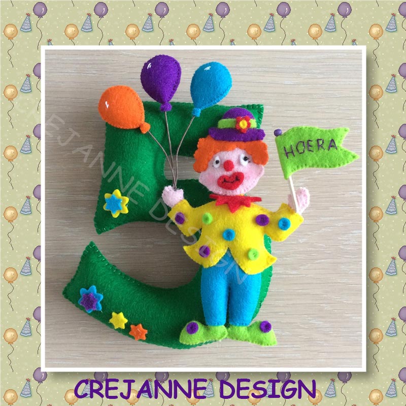 De CLOWN heeft ballonnen in zijn ene hand en in de andere een vlaggetje waarop ik HOERA heb geborduurd, maar het is ook leuk om de naam van de jarige erop te borduren.